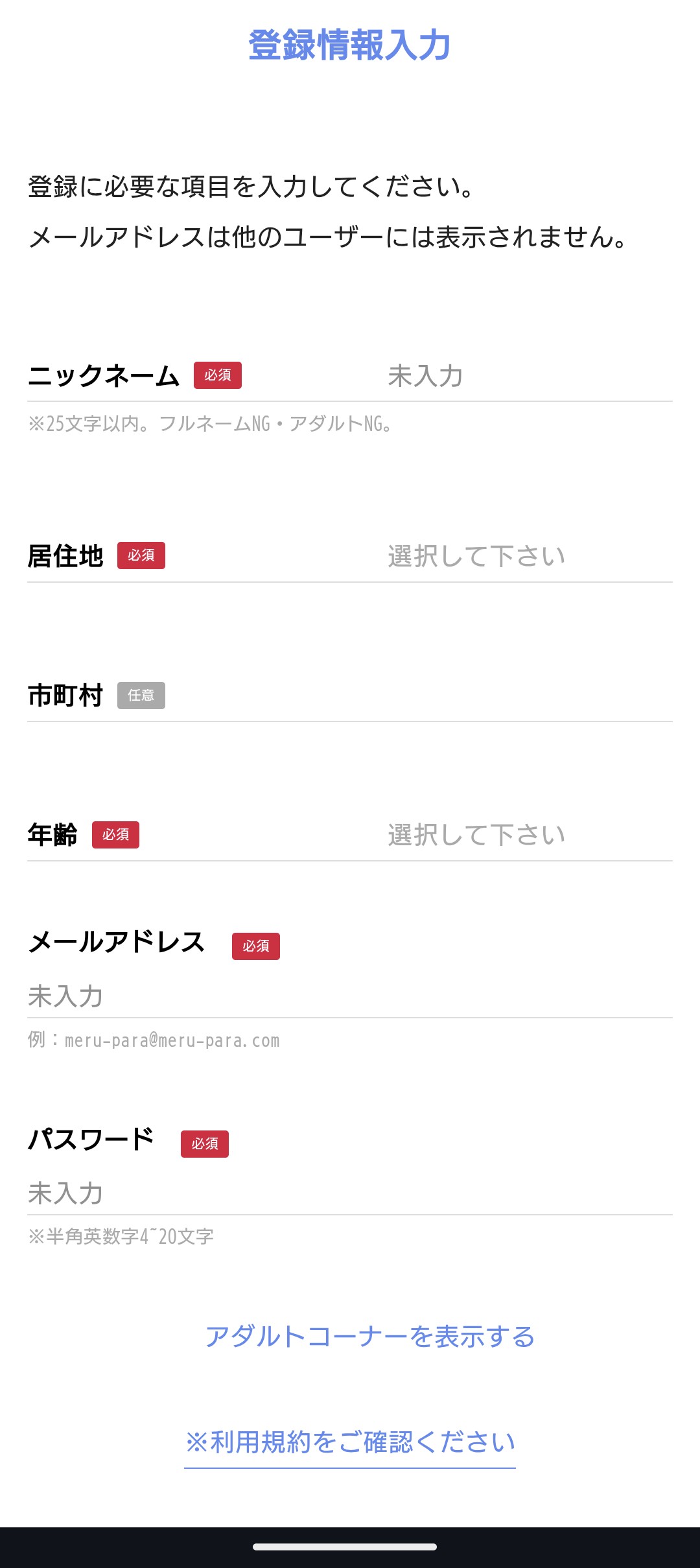 登録に必要な情報はニックネーム、居住地、年齢、メールアドレス、パスワードだけです。