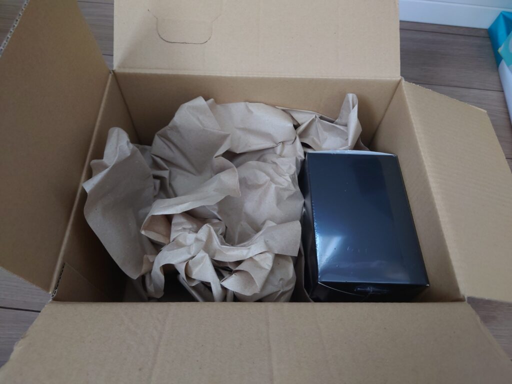 箱も真っ黒で中身が全く分からないです。さらに薄いビニール製での梱包があるので開封防止にもなっています。